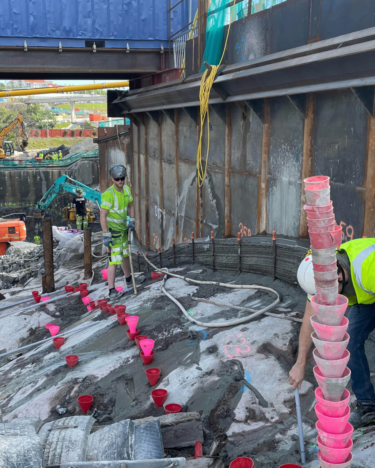 Även de minsta sprickorna kan vid sprängning och utgrävning av berg växa sig stora och utgöra en risk. Vi arbetar därför både förebyggande genom att täta sprickor inför bergarbeten och under arbetets gång för att fästa lösa stenblock.